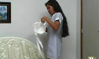 Asian teen maid doing the cleaning shows culo upskirt