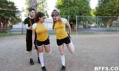 Sexy football ladies are fucked and jizzed by horny coach with huge cock